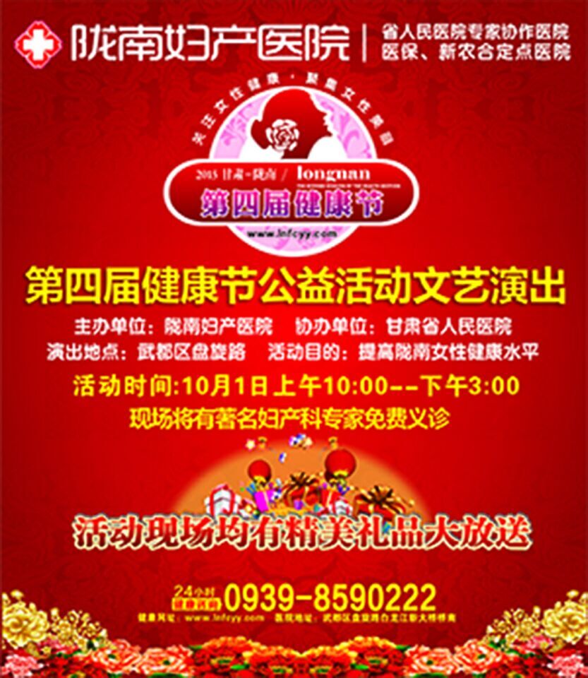 活动背景: 健康是人全面发展的基础,关系千家万户幸福,人大会议曾提出:“健康是促进人的全面发展的必然要求”,这表明国家对人民健康重识。为响应国家卫计委号召,唤醒陇南人民的健康意识,陇南妇产医院每年举行一届健康节;金秋十月,硕果累累,陇南妇产医院第四届健康节暨公益文艺演、现场义诊出活动于10月1日(国庆节)在武都区盘旋路如期举行。